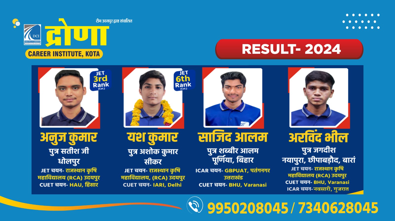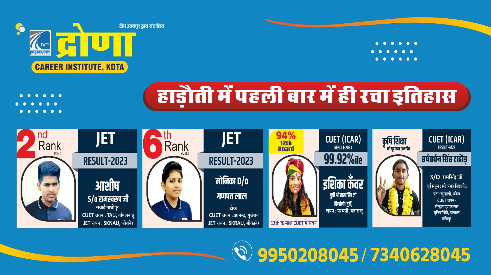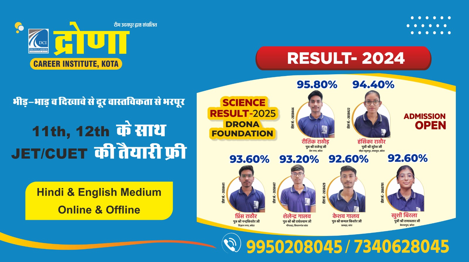 J"Drona Career Institute, Kota empowers students in Kota, Rajasthan, India to achieve success in Competitive Exam in Engineering, Medical & Agriculture and related Examinations. We offer both Online and Offline Coaching to equip students with the knowledge and skills required to excel in entrance exams like IIT-JEE, NEET, JET, CUET, and ICAR."