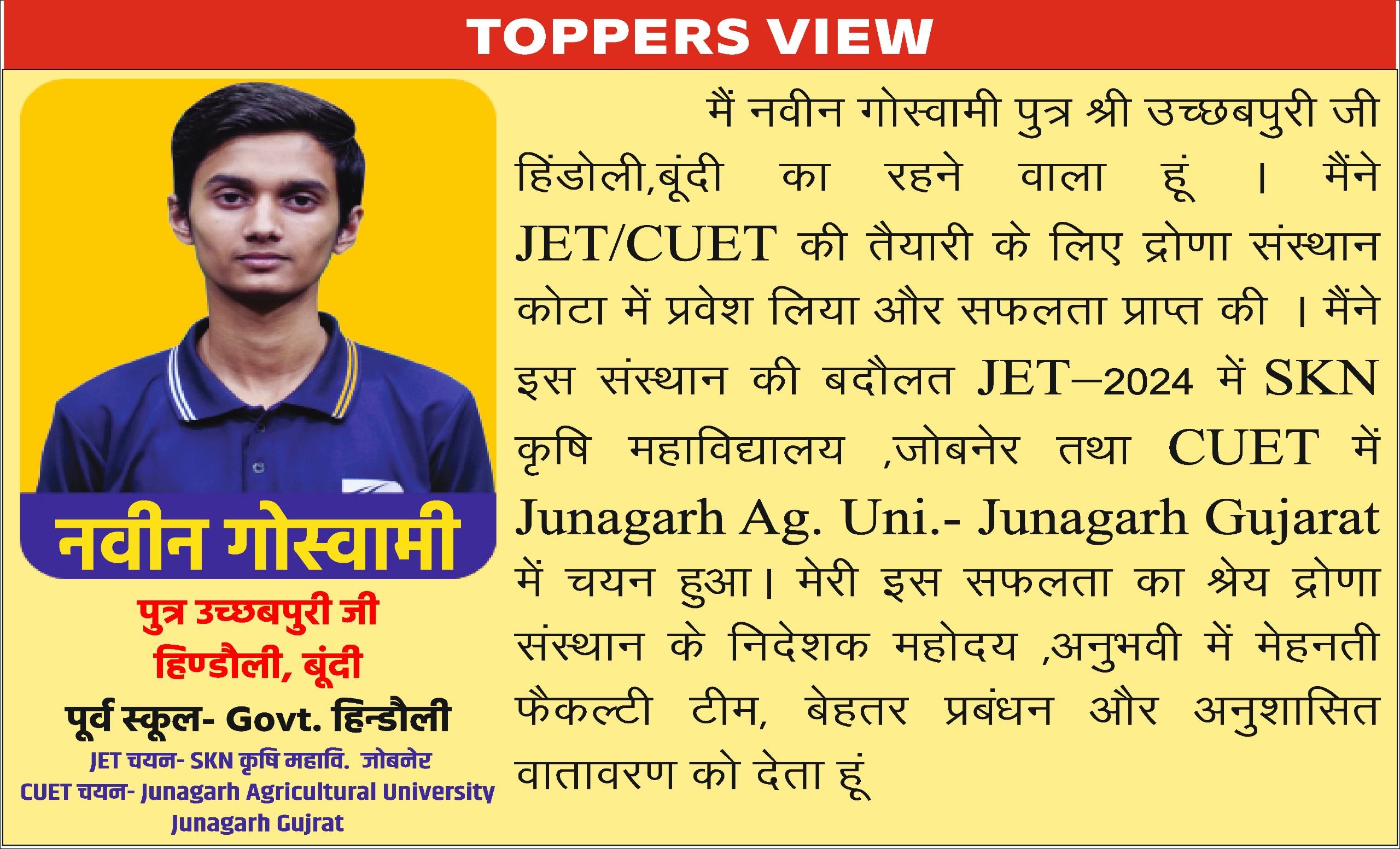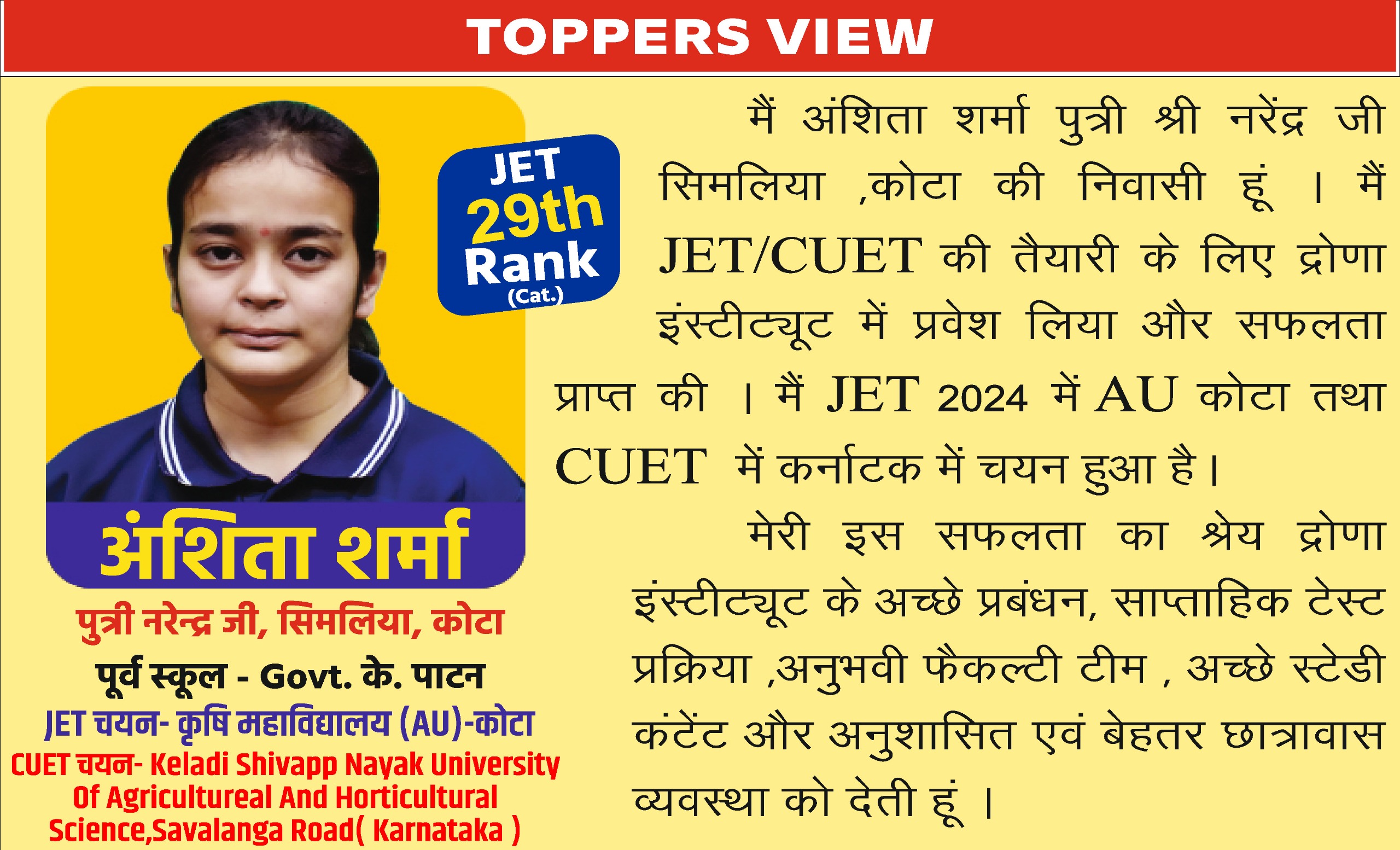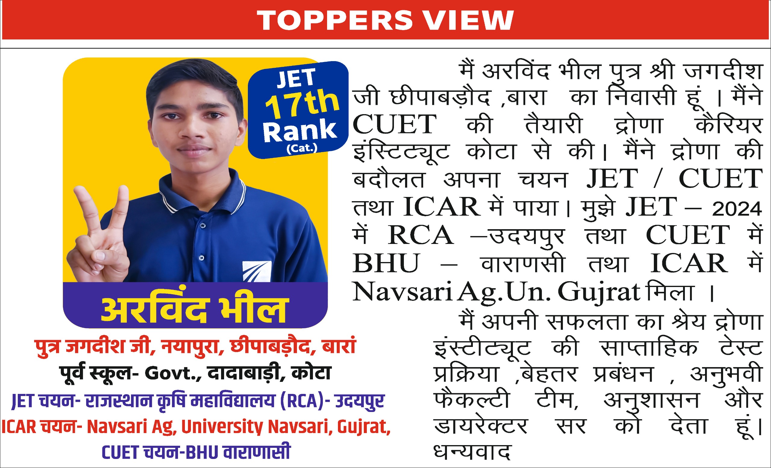J"At Drona Career Institute, we empower students in Kota, Rajasthan, India, to achieve success in competitive exams for Engineering, Medical, Agriculture, and related fields. Our institute offers both online and offline coaching,equipping students with the knowledge and skills necessary to excel in entrance exams like IIT-JEE, NEET, JET, CUET ( ICAR ), BHU, B.ScNusing, RPVT, NDA, Agriculture Supervisor, Pre-PG, AAO.