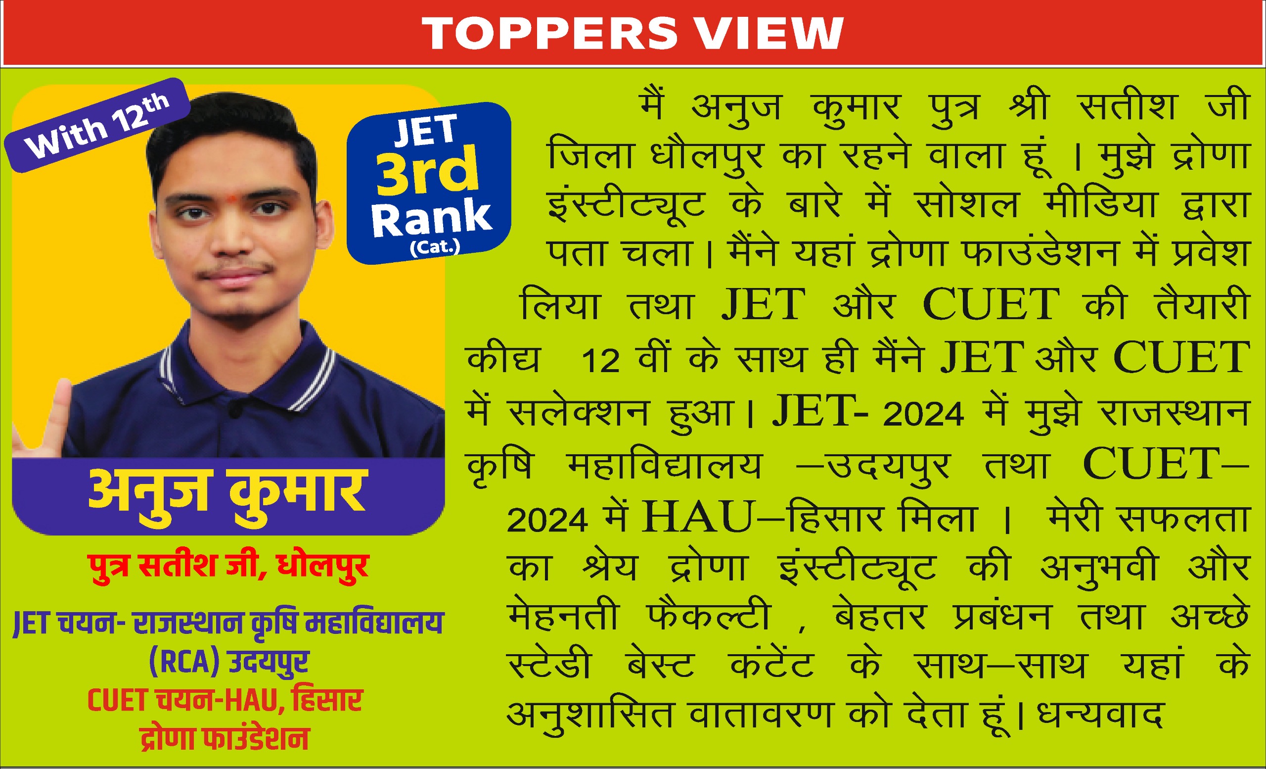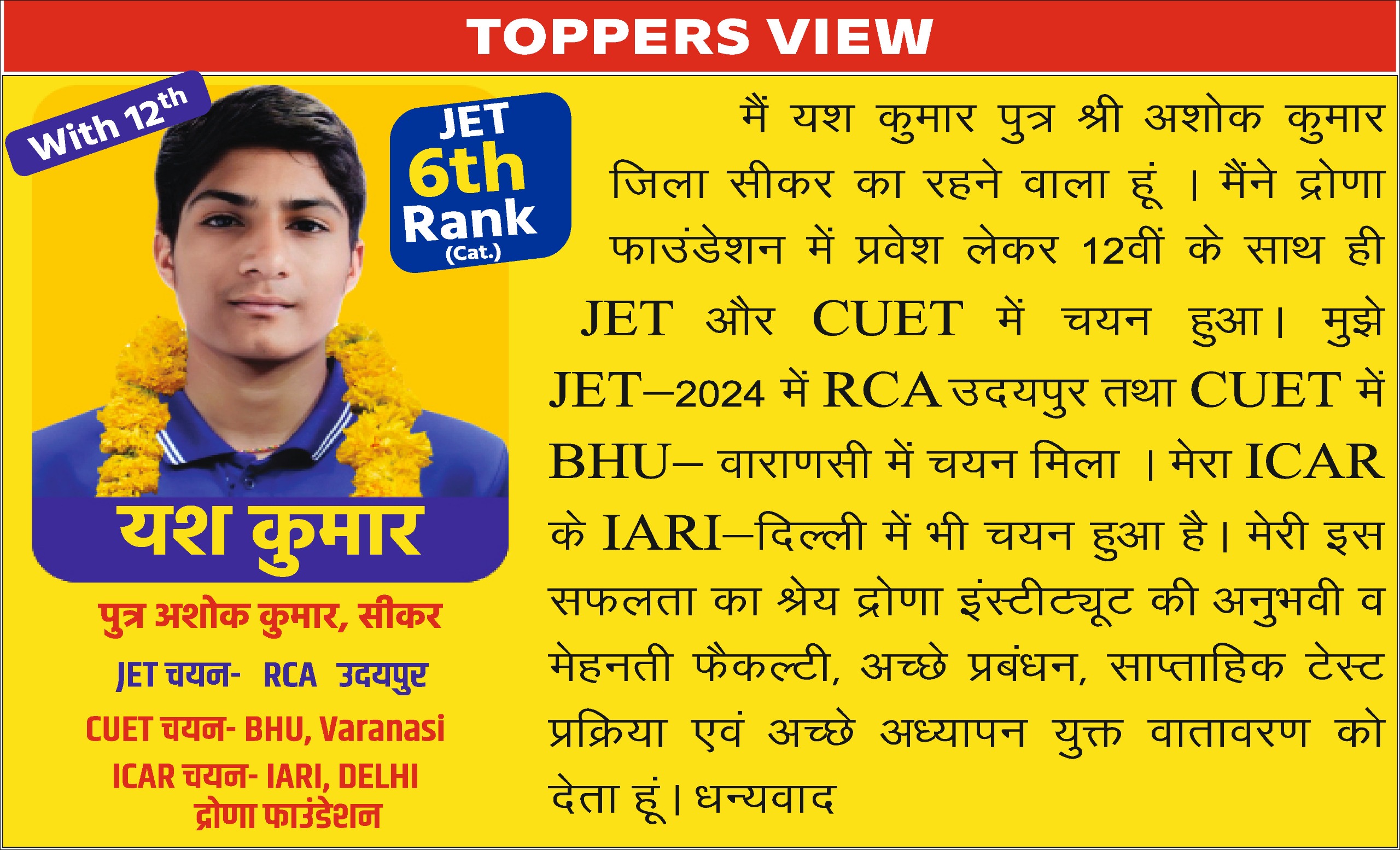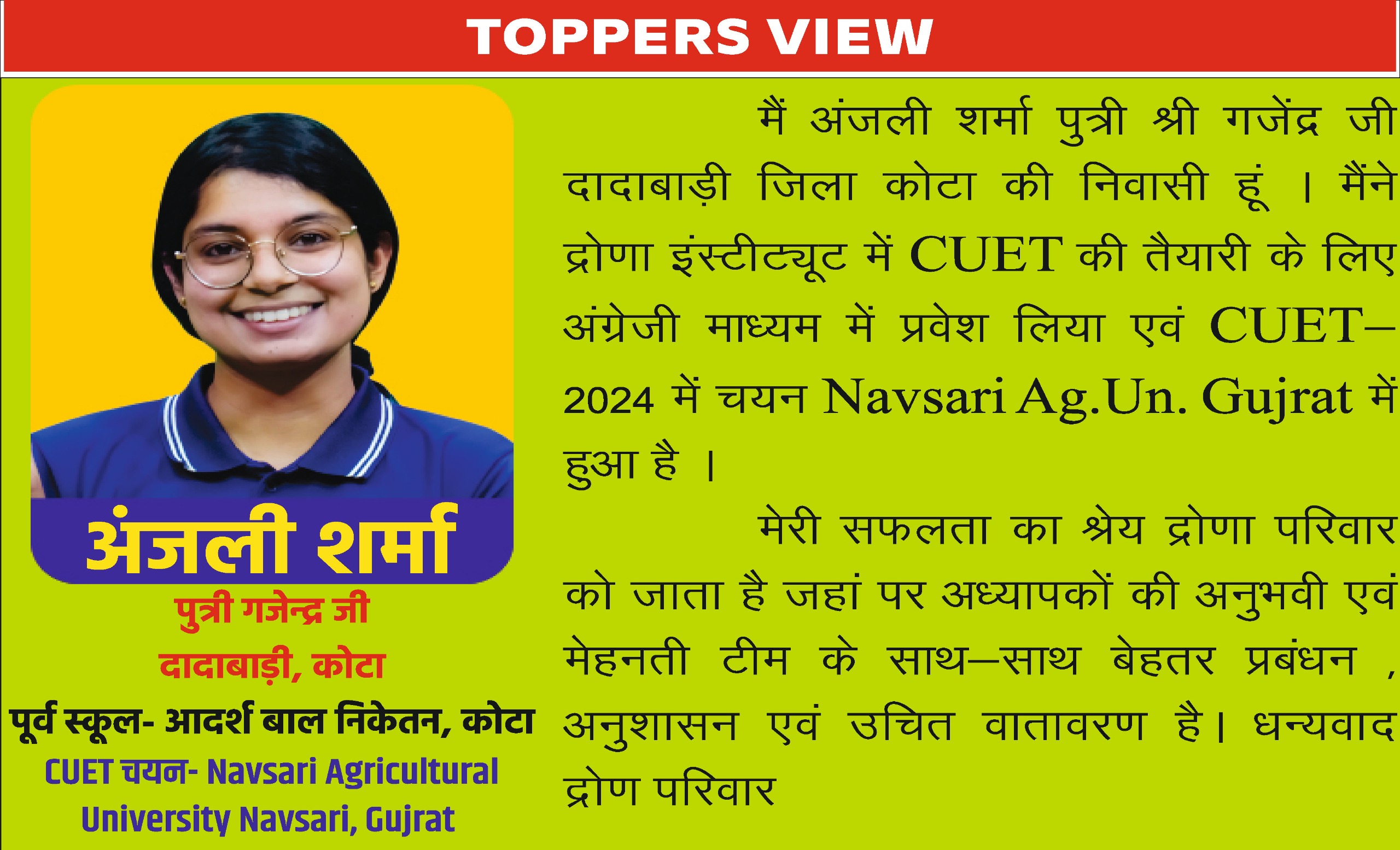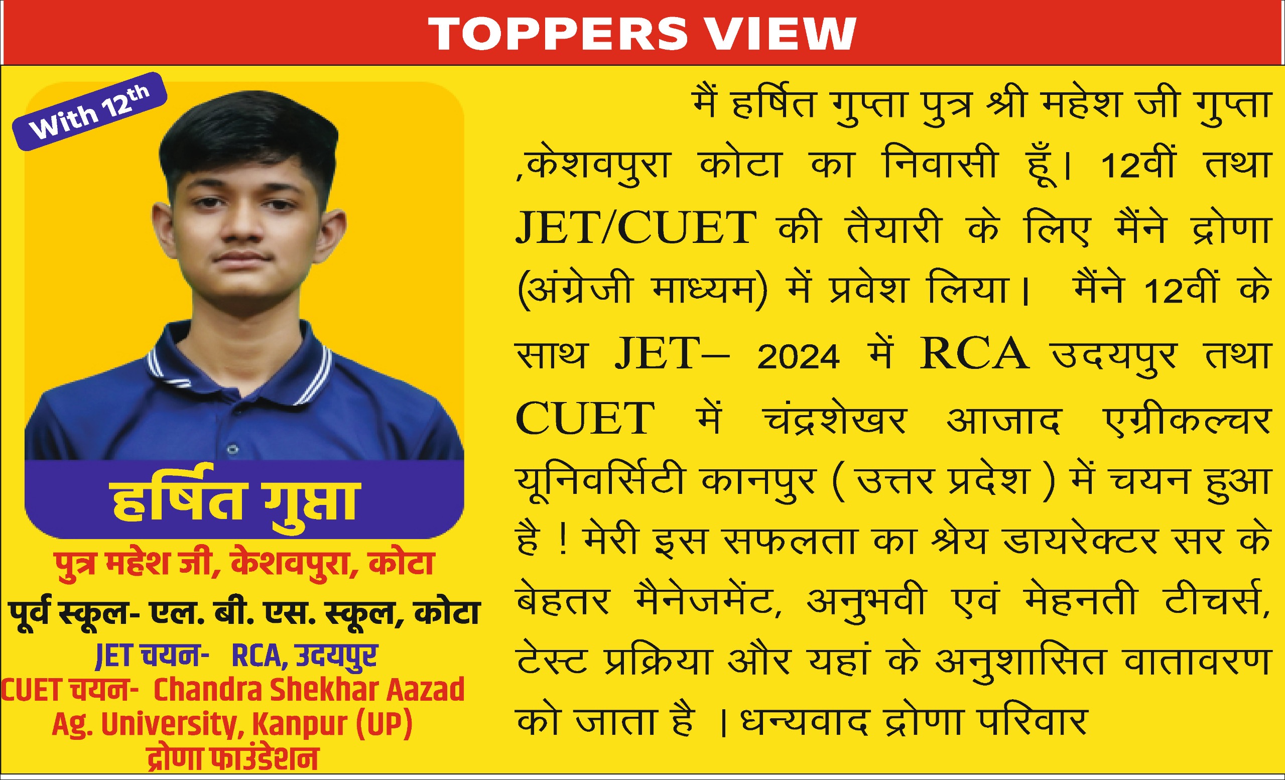 J"At Drona Career Institute, we empower students in Kota, Rajasthan, India, to achieve success in competitive exams for Engineering, Medical, Agriculture, and related fields. Our institute offers both online and offline coaching,equipping students with the knowledge and skills necessary to excel in entrance exams like IIT-JEE, NEET, JET, CUET ( ICAR ), BHU, B.ScNusing, RPVT, NDA, Agriculture Supervisor, Pre-PG, AAO.